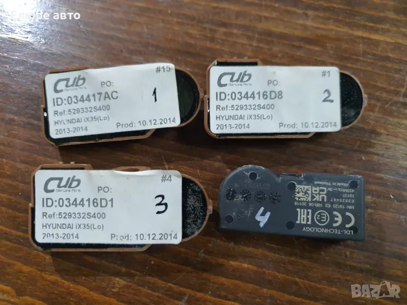 Продавам 4бр.Tpms сензор,датчик с вентили за налягане в гумите за Hyundai iX35. Пасват и за др.мод.коли. Проверени,работещи и са в изправност.Цена за 4бр.120лв.