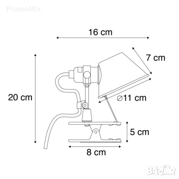 Осветителното тяло Tolomeo Micro Pinza е с височина 20 сантиметра и размери на основата 5 х 8 сантиметра.