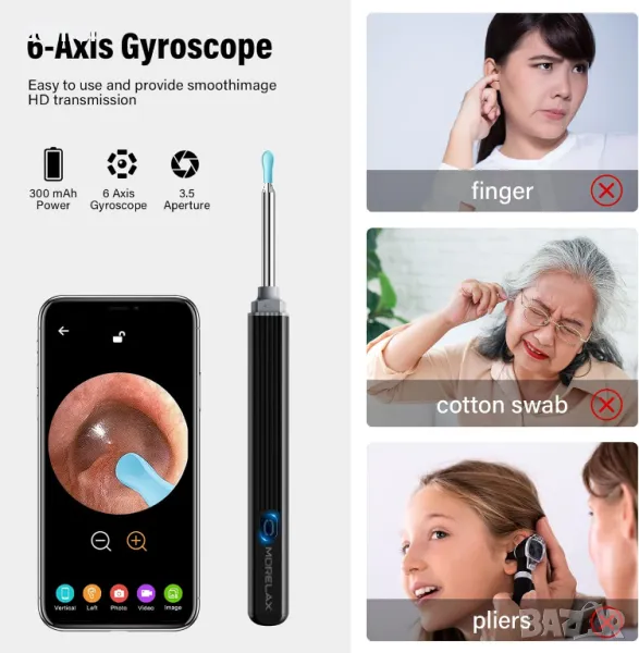 Този инструмент за почистване на ушна кал разполага с 5MP високопрецизен обектив с 360° широкоъгълен изглед, 6 LED светлини и 1080P HD резолюция за ясна видимост на ушния канал. Той се свързва чрез WiFi със специално приложение, което позволява видео в реално време, заснемане на снимки и стрийминг без забавяне с 20 кадъра в секунда, съвместимо с iOS, iPadOS и Android. Интегрираният дизайн на лъжичка за уши подобрява безопасността, като предотвратява отделянето. Акумулаторна батерия от 350 mAh осигурява 90 минути употреба с едно зареждане с 30 дни в режим на готовност. Водоустойчивият дизайн IP67 позволява лесно почистване на отоскопа, тапите за уши и лещите, но не потапяйте отоскопа във вода. Комплектът включва отоскоп, Type-C кабел, шест силиконови лъжички за уши, ръководство и комплект инструменти за отстраняване на ушна кал от осем части.
