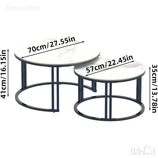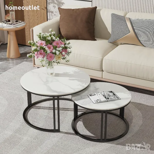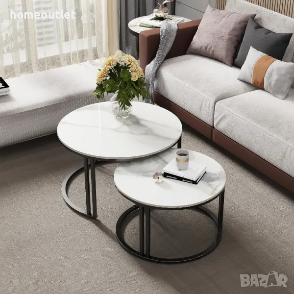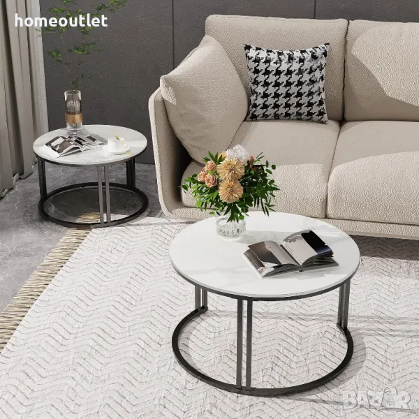 Нашият модерен комплект маси за кафе е със стабилна конструкция с плот от синтерован камък и удебелена метална рамка.
