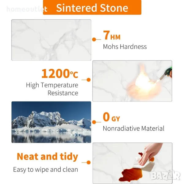 Характеризира се с висока плътност, твърдост 7 по Mohs, водоустойчивост,, устойчивост на надраскване и висока температура до 1200 ℃, без избледняване и лющене, така че можете да използвате масата в продължение на много години.