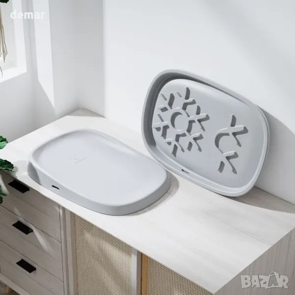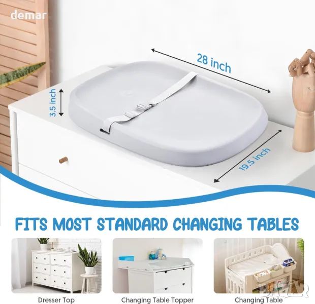 Почиства се лесно без често миене. Голям размер от 68x46 см, за да пасне на повечето стандартни маси за повиване. Разполага с удобен дизайн с двойна катарама за използване с една ръка, с регулируема презрамка, която расте заедно с вашето дете. Изработен от мек, щадящ кожата естествен премиум латекс за комфорт, равномерно разпределение на тежестта и облекчаване на натиска. Проектиран с неплъзгаща се основа за стабилност и подобрени извити ръбове за по-добра поддръжка и сигурност.