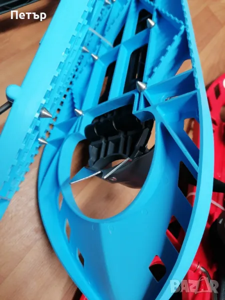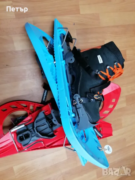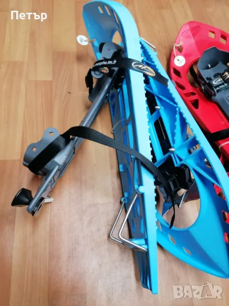 Цената е 150 за чифт при лично предаване и 175 при плащане с наложен платеж. Продавам чисто нови френски пластмасови снегоходки за човек до 120 кг. Цветове - син и червен. Тегло за чифт 1550 грама. Дължина 61 см. Отдолу имат зъби и шипове.