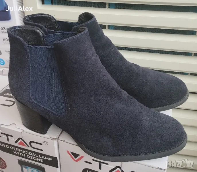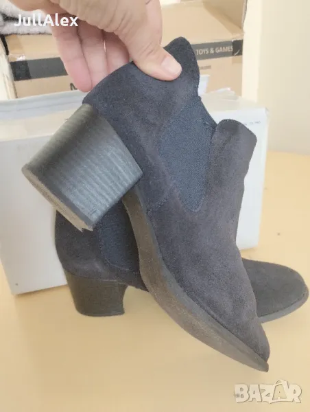 Дамски боти от тъмно син велур, почти черни. Височина на тока 5 см. Много леки и елегантни, в същото време удобни за пролетно/ есенния сезон. Обувани са само няколко пъти, и са съвсем запазени.