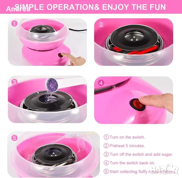 Машината е с компактни размери и противоплъзгащи крачета. Можете освен обикновена захар да поставяте и твърди бонбони. Употребата и е изключително лесна. Просто включвате да загрее след това изключвате за да поставите захар или бонбони, включвате отново и започнете да събирате памука.