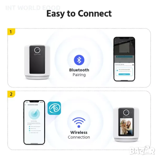 Безжична Wi-Fi свързаност: Работи чрез Wi-Fi, позволявайки лесна инсталация и свързване без нужда от кабели. Връзката е стабилна при 2.4 GHz Wi-Fi мрежи.