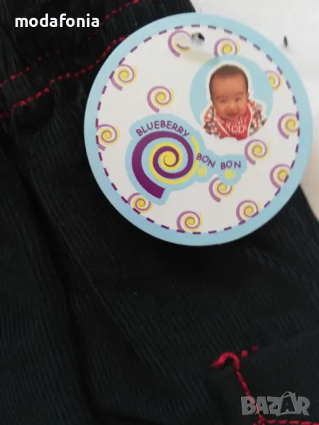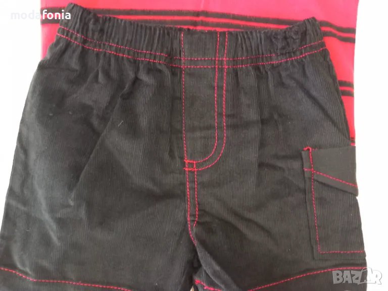 - къси тъмно сини кадифени панталонки с червени украсителни шевове и джобче отстрани