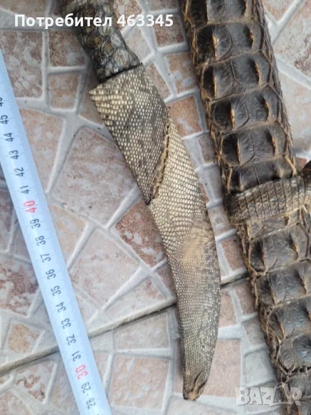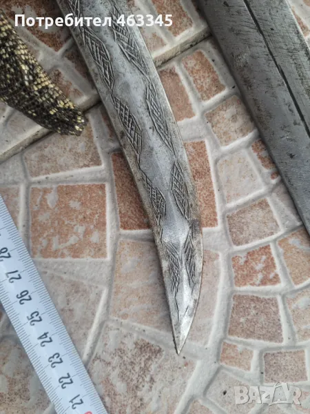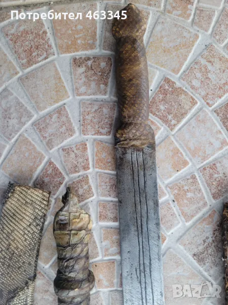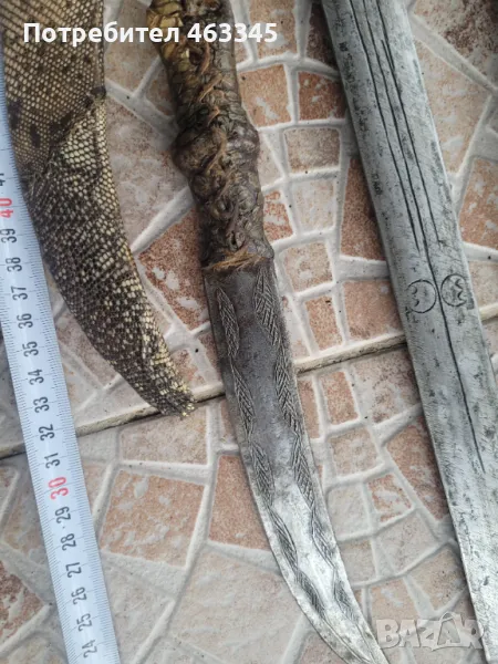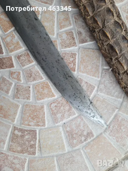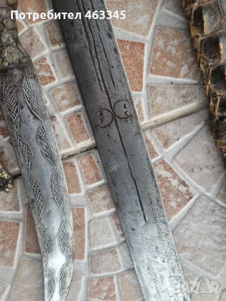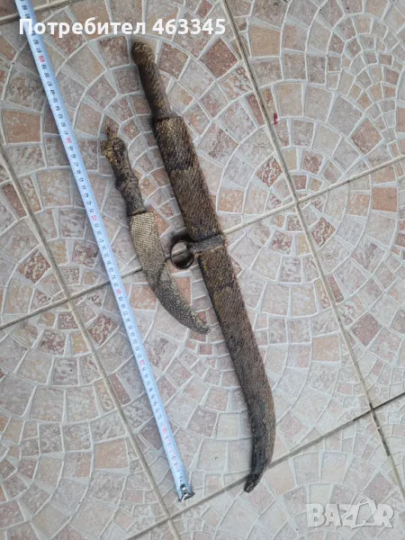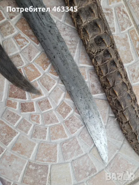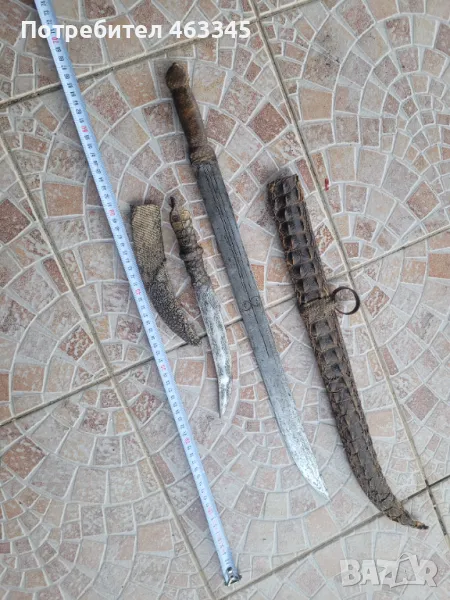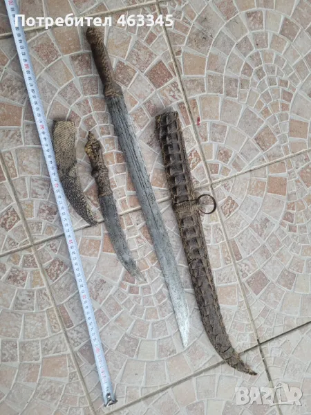 Комплект судански ножове от махдисткия период. Ножовете са били носени от суданец по време на битката за Хартум на ген. Гордън през 1984-85. Дългият нож представлява всъщност къса сабя с дръжка от крокодилска кожа и кания от гърба на малак крокодил. Малкият нож е с добре украсено острие и от двете страни от основата на дръжката (също от крокодилска кожа) практически до върха. Канията също е от корем на крокодил. И двете остриета са без ръжда и без язви, с прилична патина. 100% оригинали