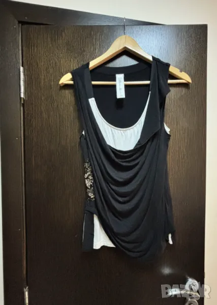 Продавам черно бял потник Карен Милен. Размер 10. Потникът е разчупен, отпред с 2 пласта - бял и черен. Има набор и ефектна бродерия с мъниста отстрани. Материята е памук, но заради пластовете и детайлите, е много интересен.