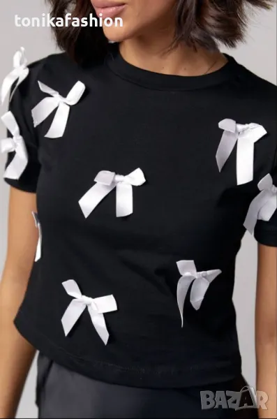 Къса тениска с панделки, леко свободна кройка. Размери m,l