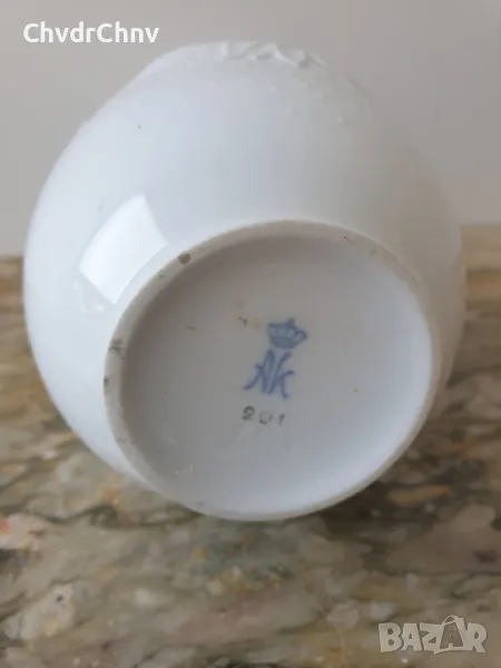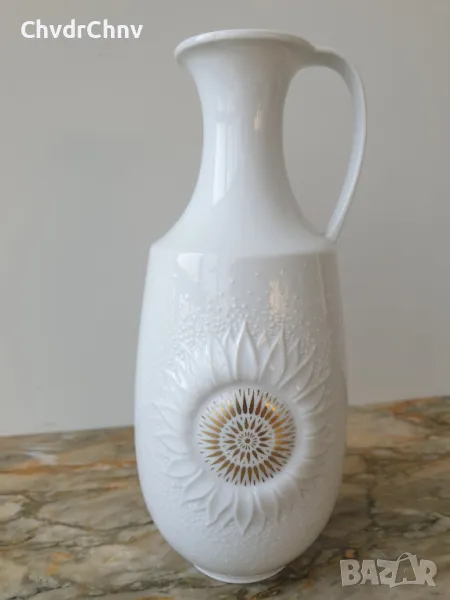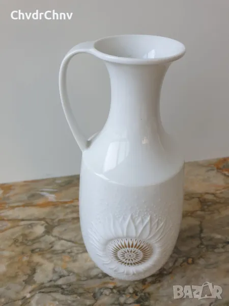 Височина 23 см, диаметър 9 см (макс), отвор 5 см, двустранна, плътен порцелан, релефна (гланц) с 24К позлата, маркировка/печат отдолу на АК/ALKA Kaiser Bavaria (последната снимка).