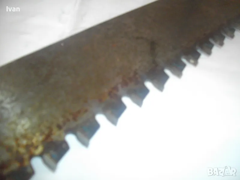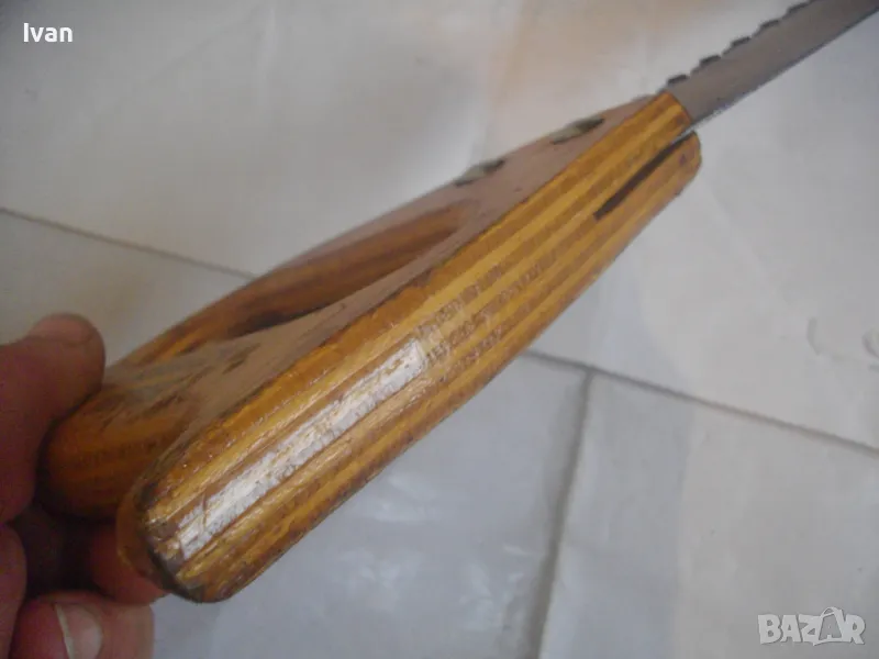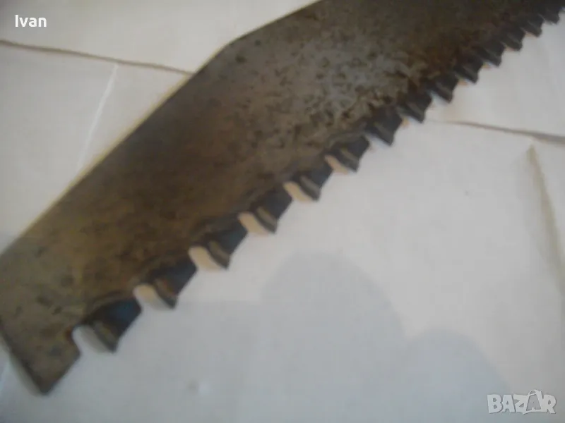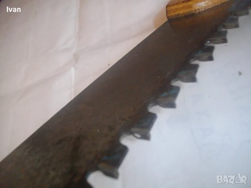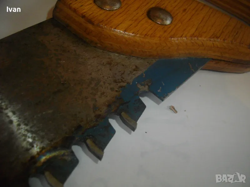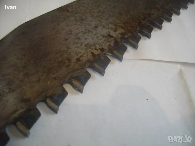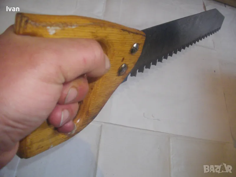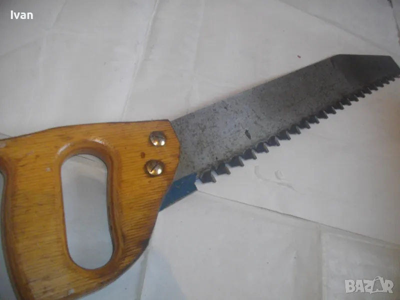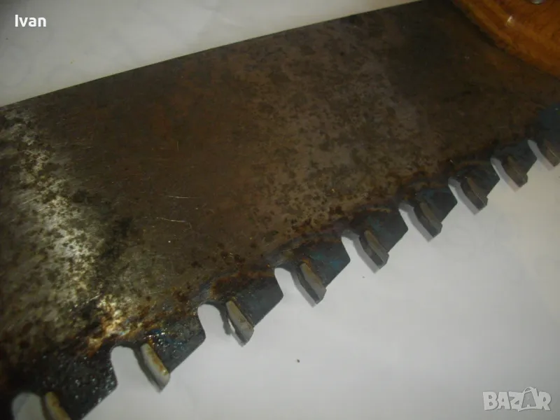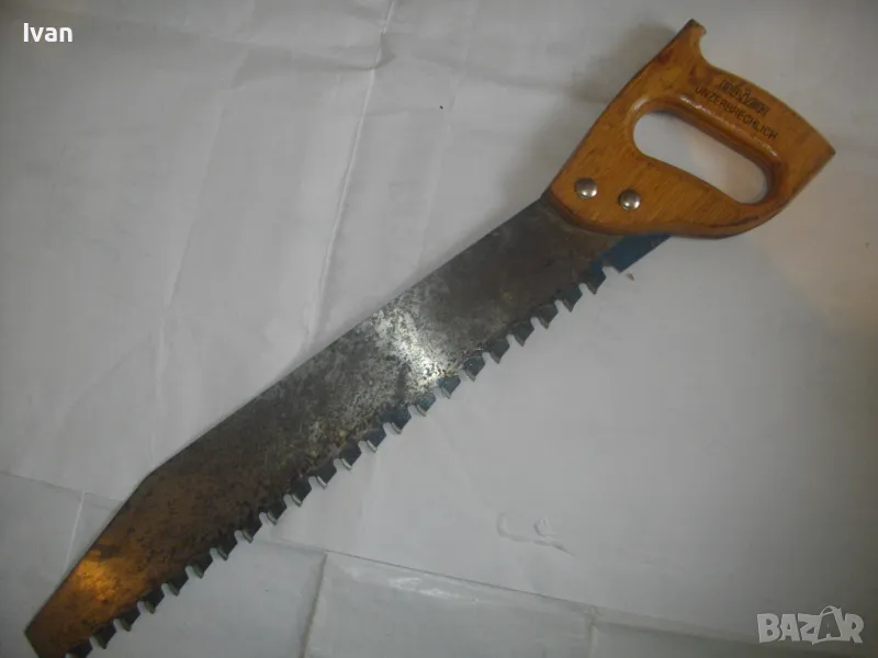 ОПИСАНИЕ на голям немски трион с видирани зъби/дървена дръжка - 129 лв. Почти нов, голям професионален ръчен трион за рязане на блокчета Итонг, и други керамични идръвени повърхности, немски стар, висококачествен модел на Байер, с голяма работна държина от 400 мм и 22 броя твърдосплавни частици на зъбите. Марка на инструмента - Baier Underbrechlich. ЦЕНА - 159 лв. Моля, не ми предлагайте цени различни от обявената.