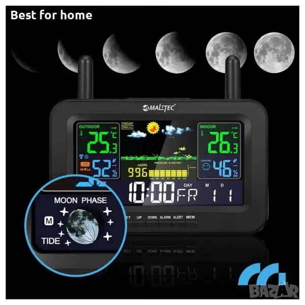 Устройството проследява и фазите на луната, което е полезно за тези, които планират дейности на открито, като риболов или наблюдение на нощното небе.