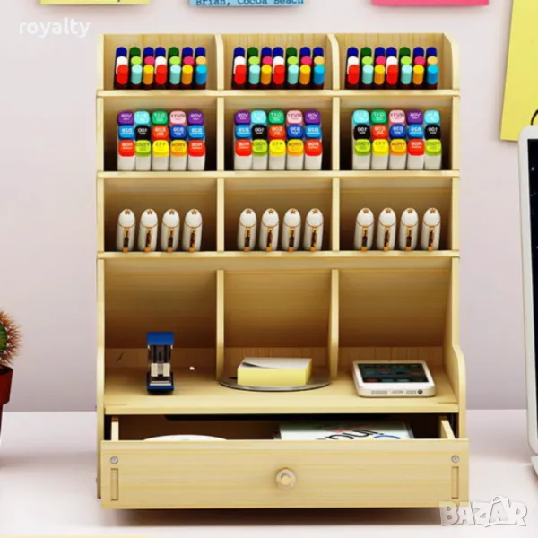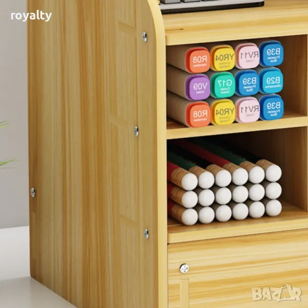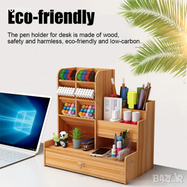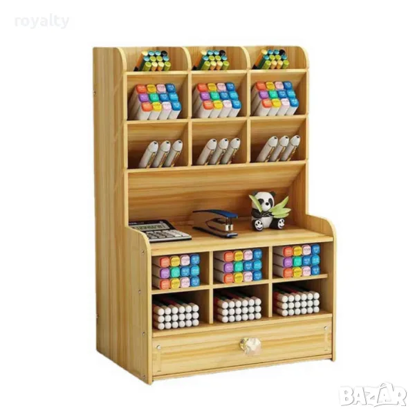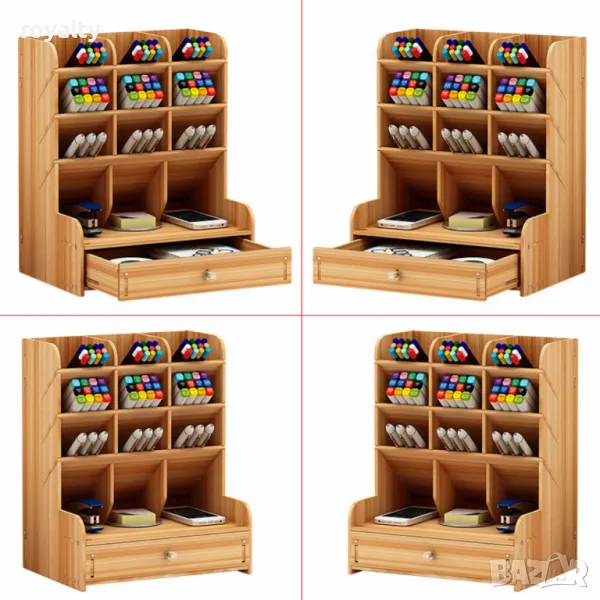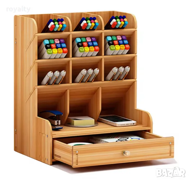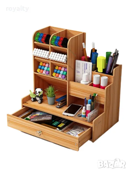 Дървен органайзер за бюро с чекмедже и многосекционно съхранение