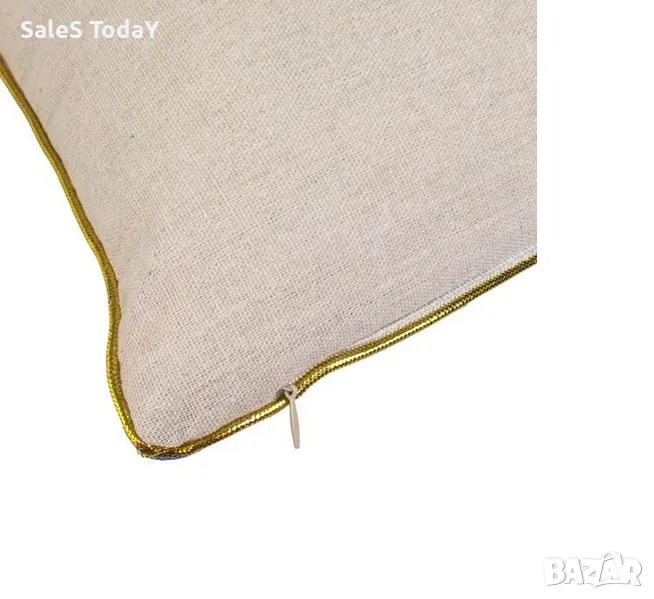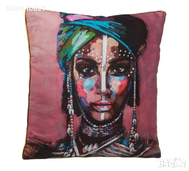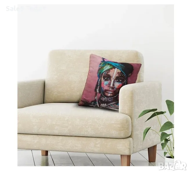 Квадратна декоративна възглавница за диван с принт на женско лице. Еднолицев е с цип в бежов цвят със златна лента по периметъра.