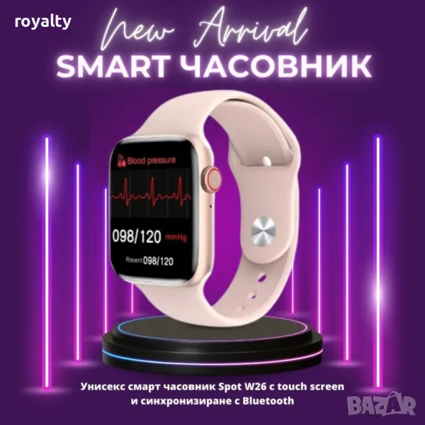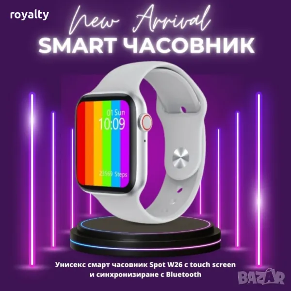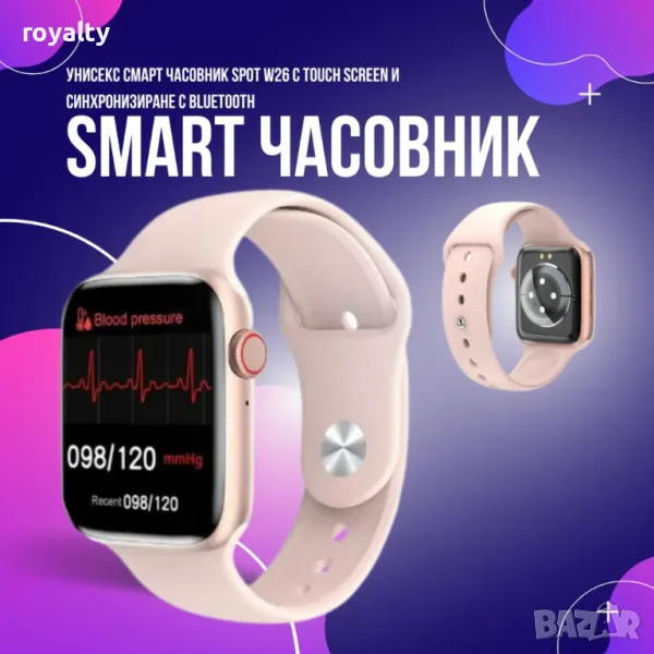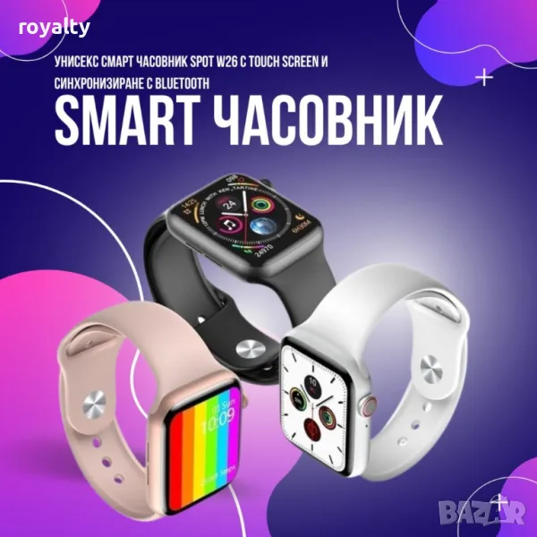 Унисекс смарт часовник S p o t W26 с touch screen и синхронизиране с Bluetooth / Дисплей: 1,75“ HD IPS, 320х385; Touch screen 2.5D; Каишка: силиконова сменяема; Bluetooth версия: 4.0; Съвместим с: Android, iOS; Водоустойчивост: IP65; Сензор за сърдечен ритъм; Методи за обработка: OEM обработка; Капацитет на батерията: 220mAh; USB зарядно; - ЧЕРЕН , БЯЛ , РОЗОВ!