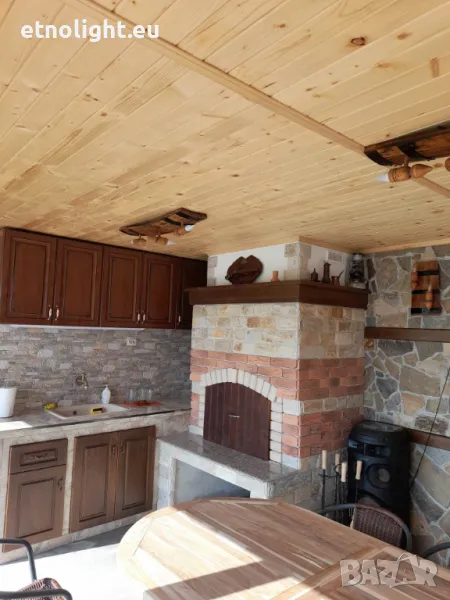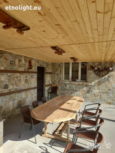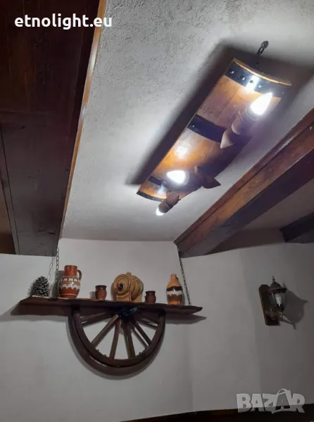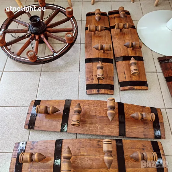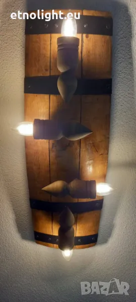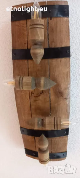 Полилеи от автентични рестарирани бъчви с 4 ръчно изработени дървени чашки-конус,фасунгите са Е 14 ,цвят по избор,дължина 75 -80см, могат да бъдат с 3 чашки тогава цената е 115 лв