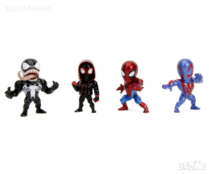Комплект Jada Toys от 4 фигурки MARVEL Spider-Man (Spider-Man, Venom, Miles Morales, Spider-Man 2099) – 4 метални колекционерски фигурки, 6 см всяка, за фенове и колекционери на възраст над 8 години. изпълнени с екшън дуели в детската стая или като привличащи погледа във витрината – със своята здрава метална осанка и изразителна поза на супергерой, култовите фигури са идеално оборудвани за всички предстоящи приключения! Висококачествените колекционерски фигури са задължителни за всеки фен на MARVEL Spider-Man и са идеални за подарък.
