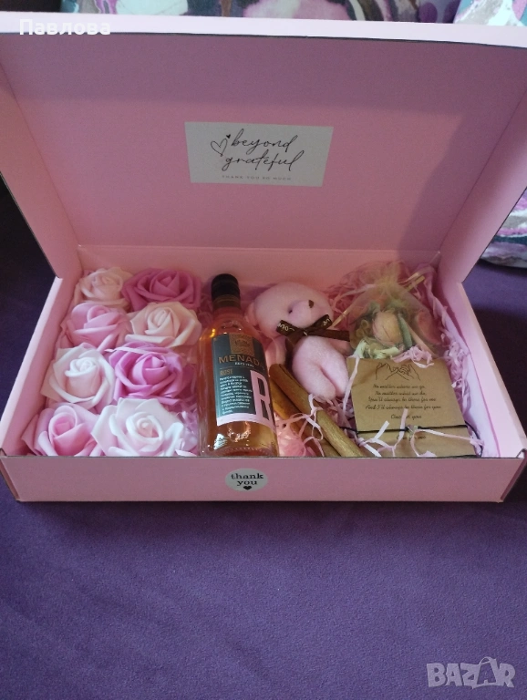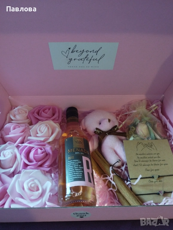 Комплектът се състои от рози, плюшено мече, ароматни листа и пури, луксозно вино Розе, двойка гривни, символизиращи любов, приятелство, споделеност между майка и дъщеря, влюбени двойки или истински приятели. Всичко това в луксозна кутия и създадено с много любов.