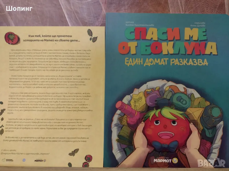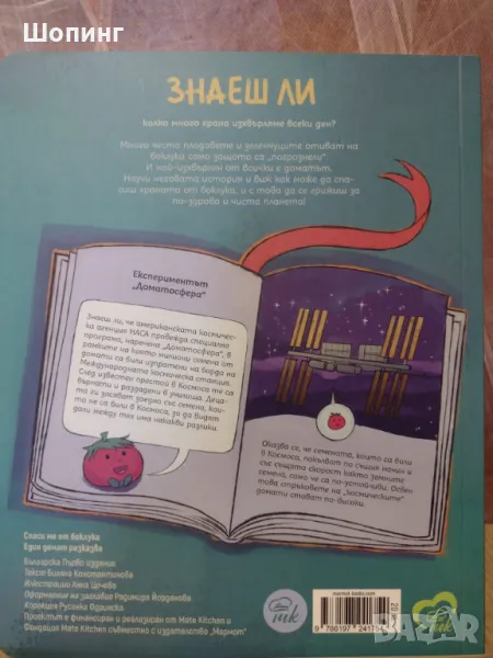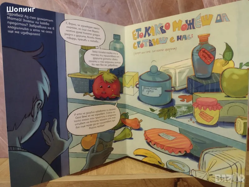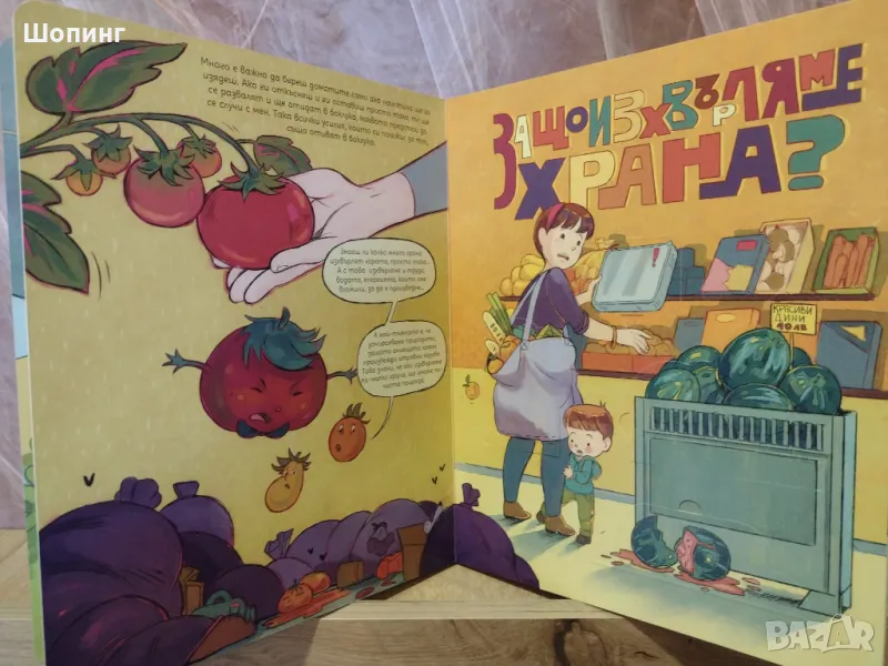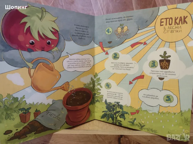 ЧИСТО НОВИ! Интерактивна книга за земеделието Спаси ме от боклука: Един домат разказва . Голяма (30 см), твърда, с дебели плътни страници с интерактивности - отварящи се прозорчета. Много цветна, красива и интересна. Полезна за научаване как да се отглеждат зеленчуци, как да се прави пица и т.н.