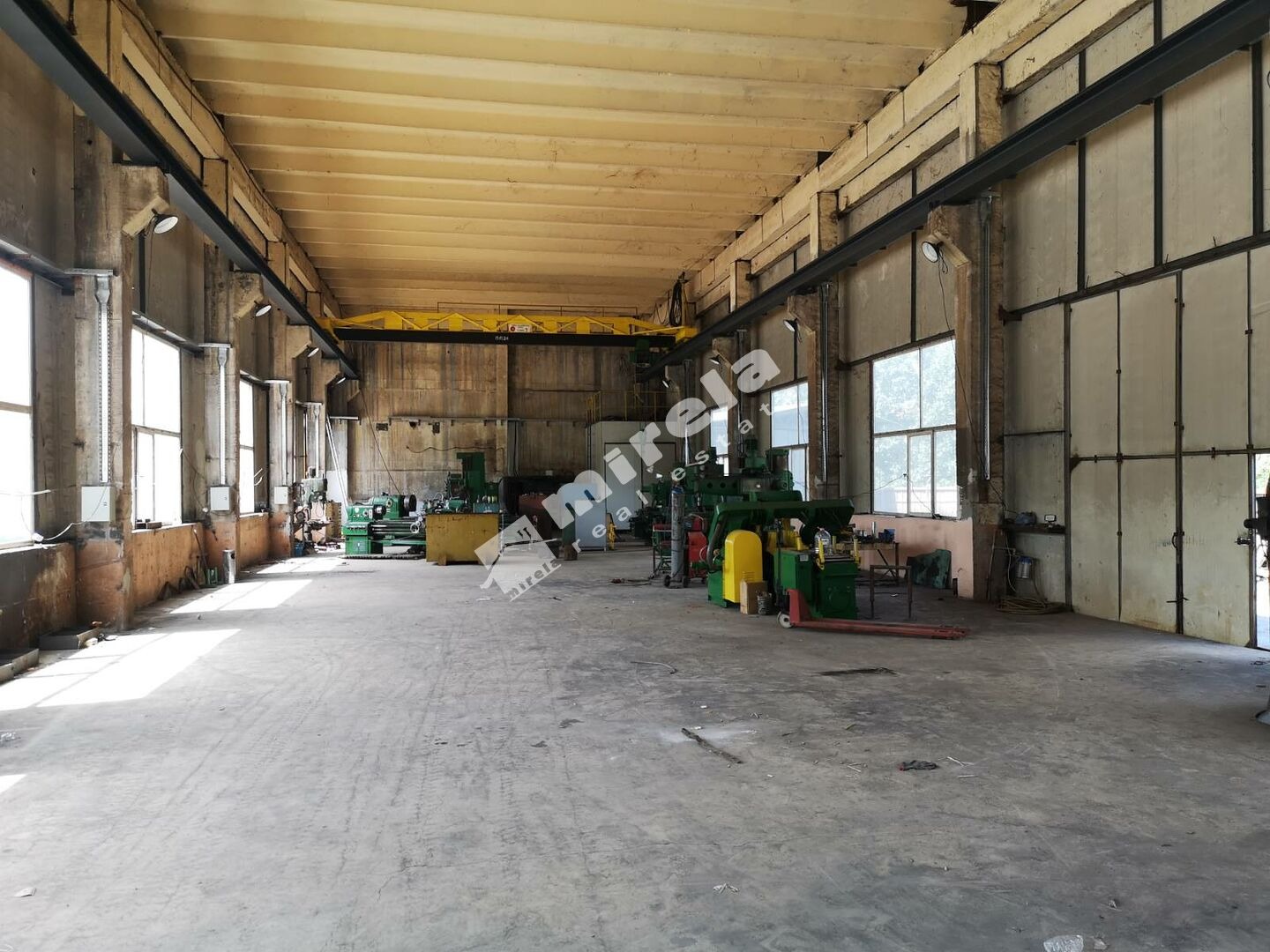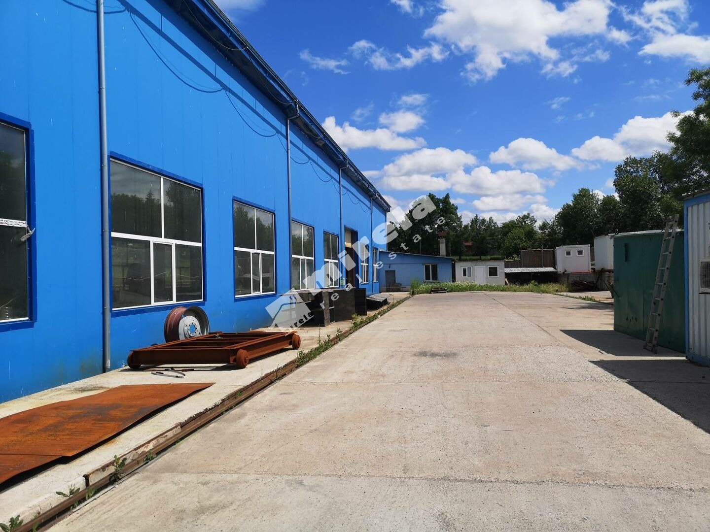 448573 Ремонтна база в с. Скалица на 36 км. от гр. Ямбол със собствен парцел от 4200кв.м., бетониран. Хале от 750 кв.м. и помощни помещения от 150 кв.м. Халето е с нов покрив от стоманена конструкция и поцинкована ламарина. Фасадите са с нова алуминиева дограма и стенни санвич панели. Входната врата към халето 5000х5000 секционна врата с ръчно управление и пешеходна врата. Халето е оборудвано с мостови кран 5т. с изцяло подменен подкранов път от греди ХЕА 300. Под от 20см. двойно армиран бетон. Помощна постройка монолитна вкючваща 2 офиса, 2 сан. възела, коридор, стая за персонала с баня към нея и склад. Отопланието е котел с водна риза. Трифазен ток с мощност 100KW. Водоснабдена към ВиК със захранващ щранг Ф60мм.