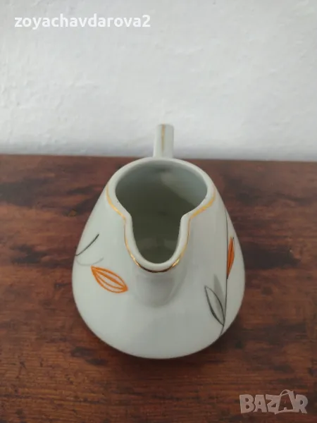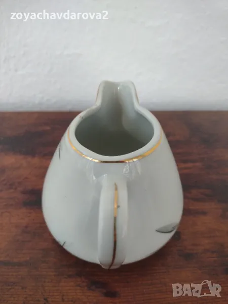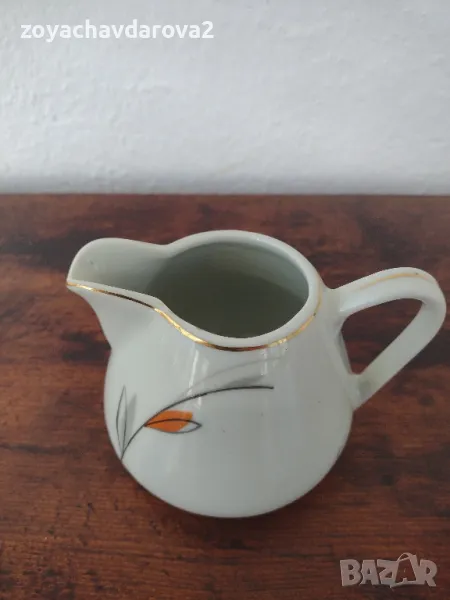 БЪЛГАРСКА ПОРЦЕЛАНОВА СОСИЕРА (КАНИЧКА ЗА МЛЯКО) ОТ СЕРВИЗ ПРОИЗВОДСТВО 1964 Г. ЗЛАТЕН КАНТ, РИСУВАНА РЪЧНО - ДЕКОР ЦВЕТЕ (ЦВЕТЕ МИНЗУХАР) ПО ЦЯЛАТА ОКРЪЖНОСТ НА ЛАТИЕРАТА. ВИСОЧИНА: 8,5 СМ. ВМЕСТИМОСТ ДО ГОРЕ: 0,350 МЛ. НОВА, НЕУПОТРЕБЯВАНА, СЪХРАНЯВАНА В ШКАФ.