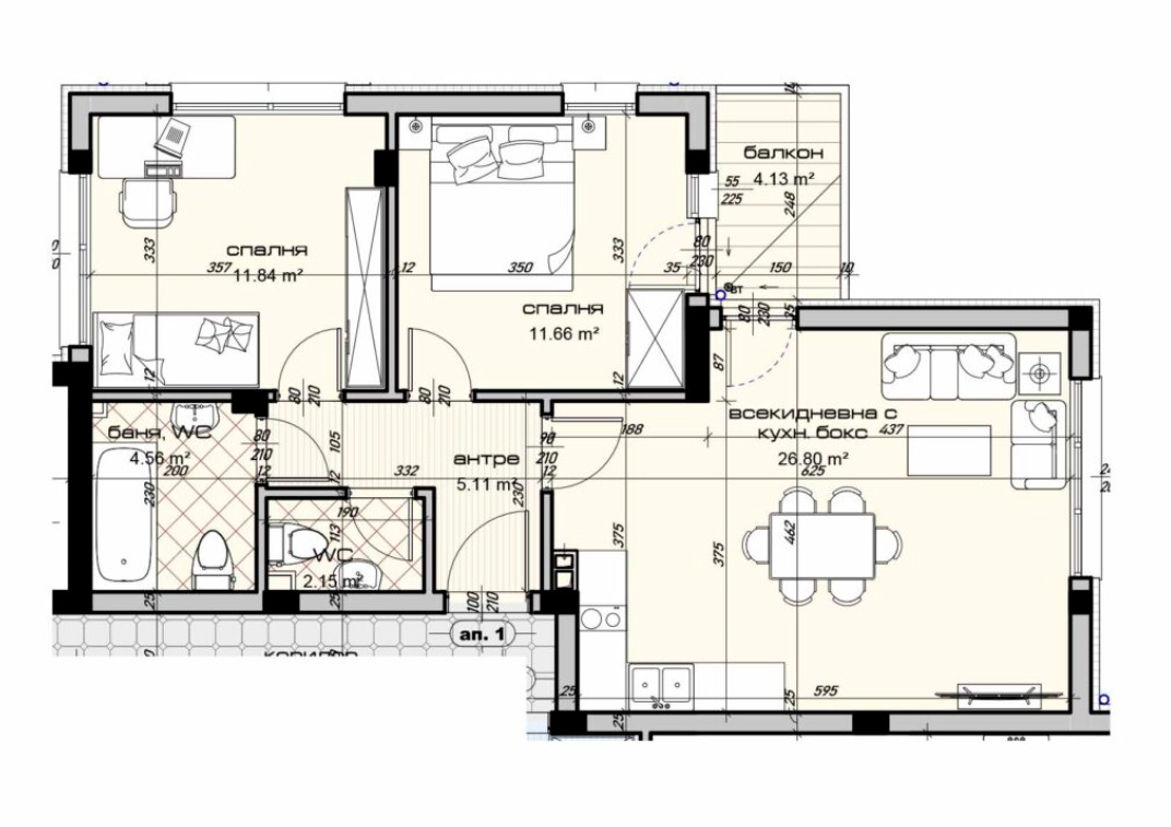 Предлагаме Ви тристаен апартамент в новопостроена сграда, разположена на тихо и спокойно място в кв. Виница. Жилищната сграда е четириетажна и има общо 23 броя апартаменти. Имотът е разположен на 1-ви етаж с площ от 101,17 кв.м. със следното разпределение: входно антре, всекидневна с кухненски бокс, две спални, WC, комбиниран санитарен възел, балкон. Към апартамента има възможност за покупка на открито паркомясто с цена 12 000 евро. Степента на завършеност ще е следната: общи части на гранитогрес; коридори, кухня и стаи: под циментова замазка, стени бяла гипсова мазилка, таван гипсова шпакловка; санитарен възел: стени и таван мазилка, под замазка, без санитарно обзавеждане; ел. инсталация: вътрешна и външна 100% завършени (монтиран електромер); ВиК външна - 100% завършена с монтиран главен водомер, вътрешна на тапа; дограма: Профили Rehau, Euro Design, 70 мм., 5 камери. Стъклопакет 24 мм 4 мм Бяло + 4 мм Енерджи; външна врата - блиндирана. Има монтирани изводи за климатици във всички стаи. Общите части на сградата са изпълнени луксозно. Оферта 2669.