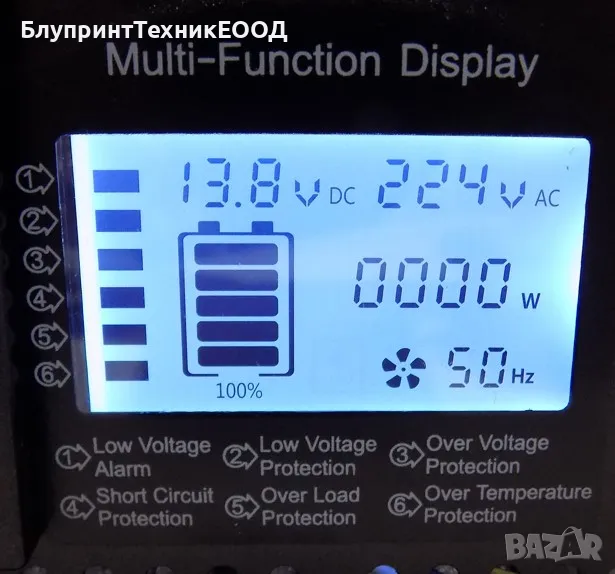 Инверторът е оборудван с всички стандартни защити за безопасност. При ниско напрежение на батерията под 10.5 V се активира звукова сигнализация, а изходът се изключва автоматично при напрежение 10.0 V.