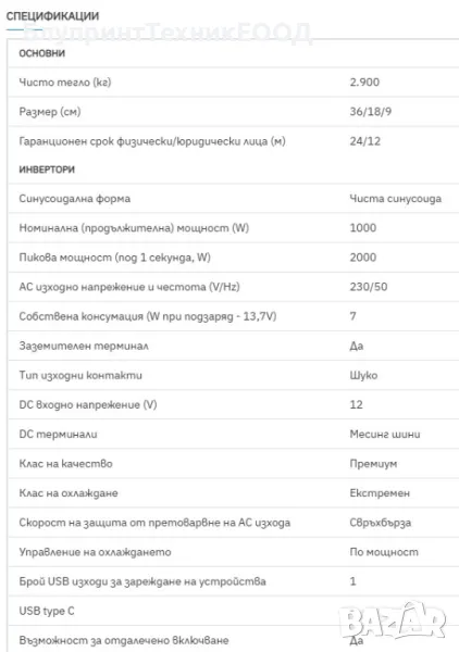 *Пикова мощност: 2000W - налична е за част от секундата! Тя е необходима за стартиране ня някои консуматори при които необходимата мощност за „развъртане“ на електромотора е в пъти по-голяма от нужната след това. За пример хладилник за домашна употреба в повечето случаи изисква стартова (пикова) мощност от около 900 вата а секунда след това продължава да консумира едва 50-90 вата. Такива електроуреди са компресорните хладилници, класическите фризери и климатици които нямат плавен старт, винтовите подемни крикове и т.н.
