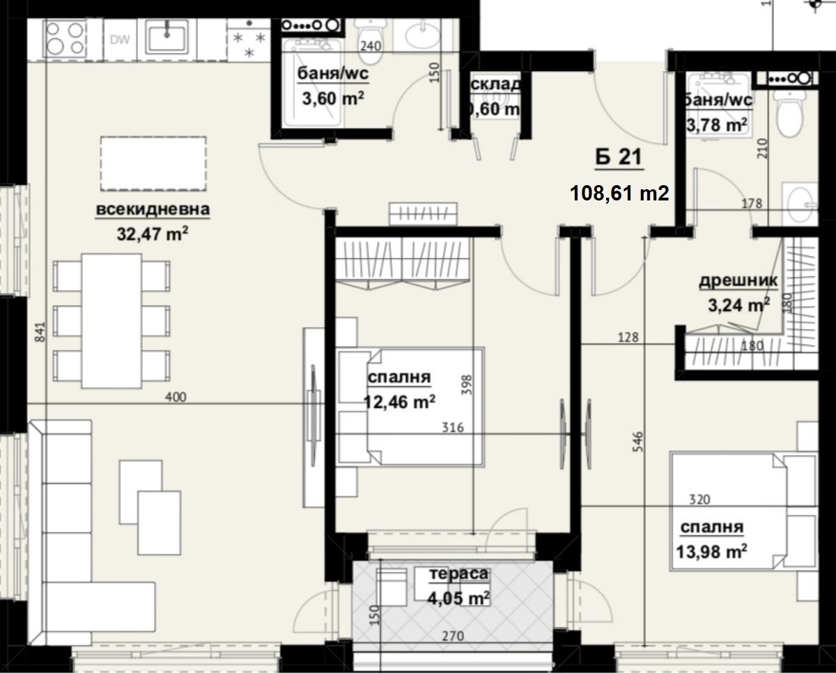 РАЗПРЕДЕЛЕНИЕ: Коридор, две бани с WC, дрешни4к, мокро помещение, две спали, всекидневна с кухненски бокс и тераса с излаз от всички стаи.