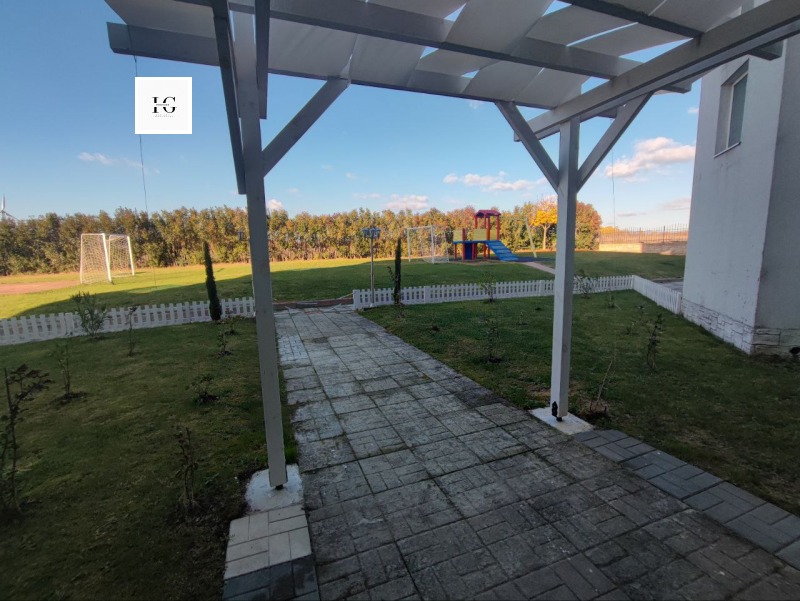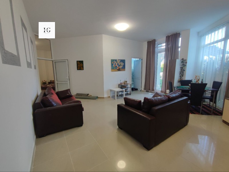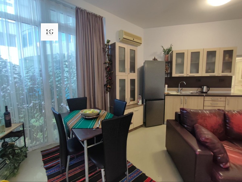 Апартаментът разполага с входно антре, просторна дневна с кухненски бокс и трапезария, три комфортни спални, баня с тоалетна и директен излаз към озеленения двор.