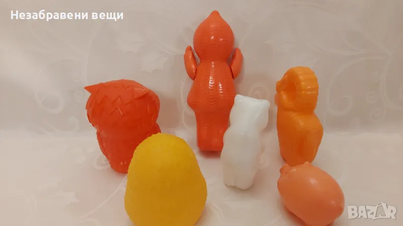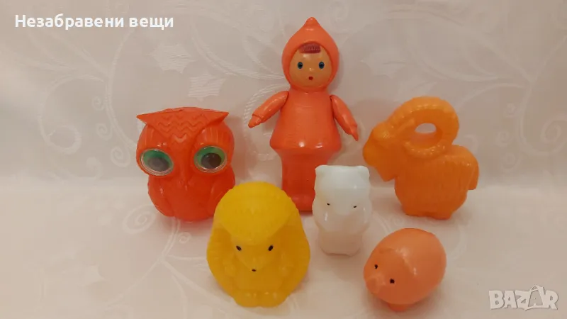 Лот от 6 броя съветски играчки от социализма, първите три снимки. Като нови, не са използвани, в много колоритни цветове, с различни размери: кукличка, ръцете й са подвижни, бухал, очите му се движат, овен, таралеж, мече и прасенце. Всички играчки са от твърда пластмаса. Стават за колекция, но и за игра. Цената за този лот е 13 евро.