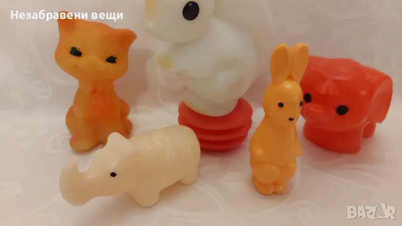Лот от 5 броя съветски играчки от социализма, последните четири снимки. Като нови, не са използвани, в много колоритни цветове, с различни размери: катеричка, която е тромба, клаксон, свирка, издава звук чрез натискане и свиване на долната й част, носорог, заек, слонче и коте, което е меко и гумено. Другите играчки са от твърда пластмаса. Стават за колекция, но и за игра. Цената на този лот е 12 евро.