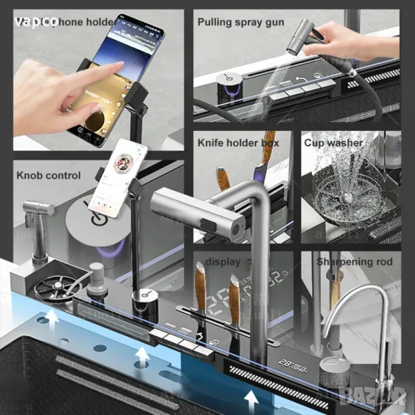 - Стойка за телефон, за да можете лесно и удобно да четете рецепти, гледате новини или слушате музика докато използвате мивката
