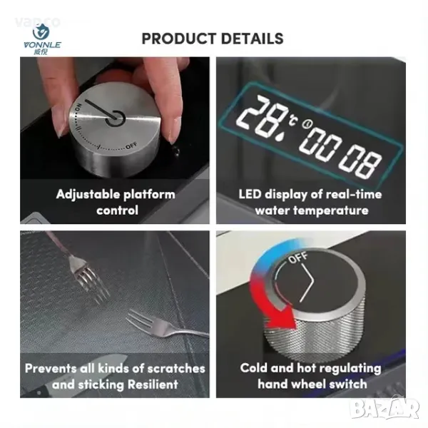 - Дисплей с индикация за температурата на водата и продължителността на използване