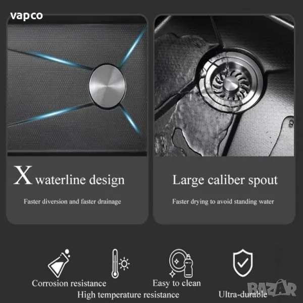 уникален водопад и подходяща дренажна кошница. Единичната голяма купа осигурява достатъчно пространство за накисване и почистване на съдове за готвене, докато наклонената основа към единичния изместен дренаж минимизира натрупването на вода. Изработена е от неръждаема стомана с нано покритие, което я прави устойчива на отчупване, напукване или изгаряне, и осигурява години красота и надеждна работа.