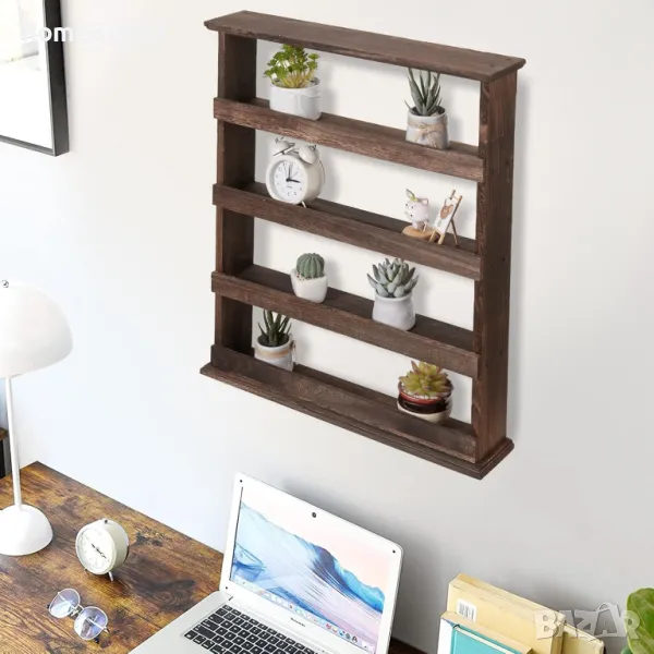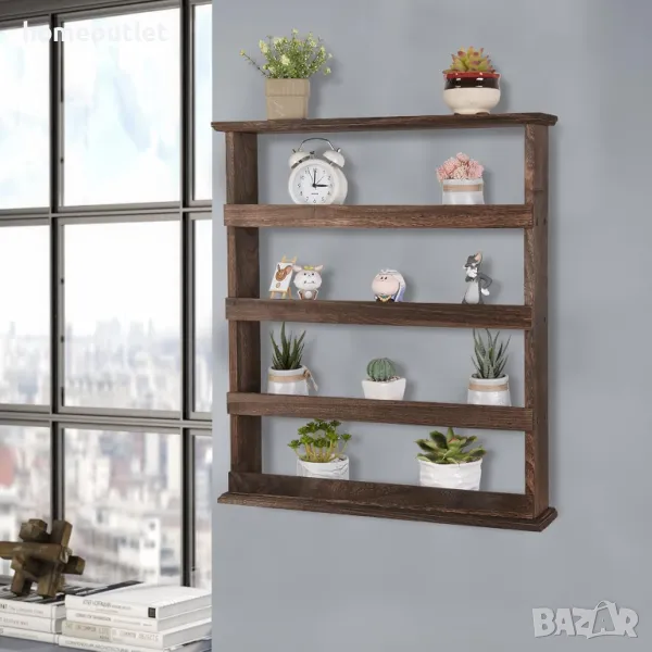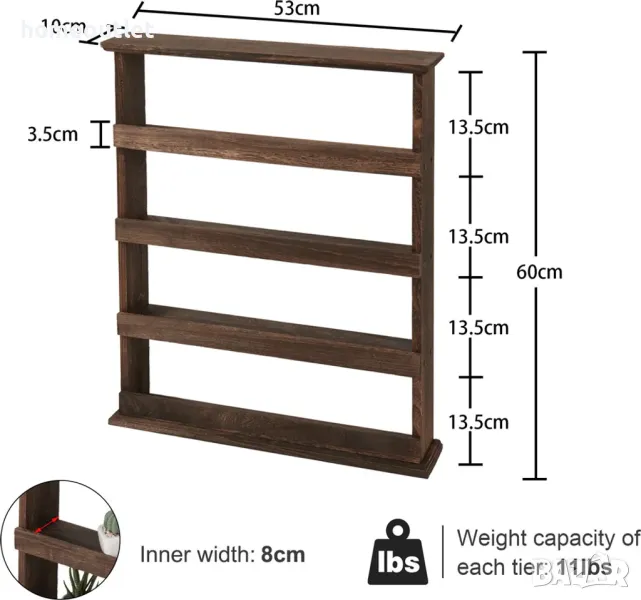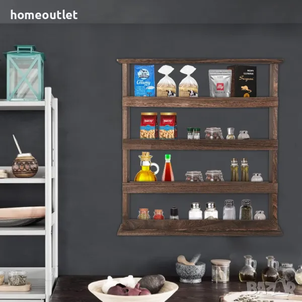 Дървеният стенен рафт има 4 нива, които предлагат достатъчно място за съхранение на подправки, етерични масла, хранителни продукти, чай, кафе и др. и поддържа кухнята ви организирана и подредена, без да заема място.