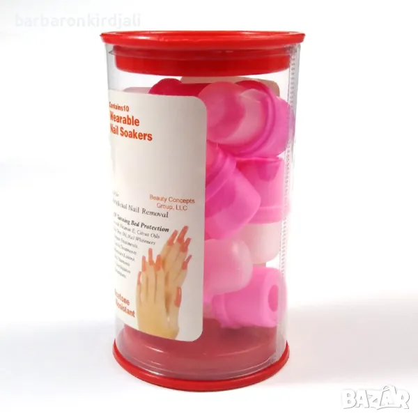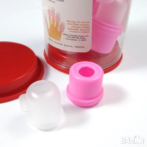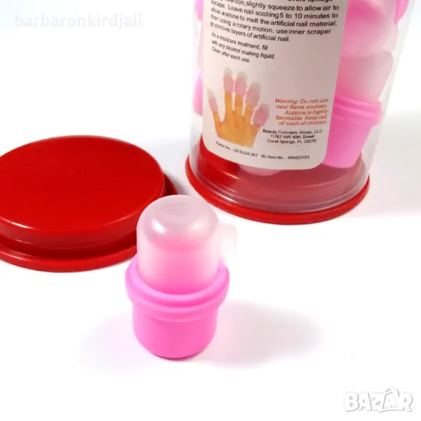 Удобна гумена основа която прилепва плътно към пръста. Устойчиви на ацетон. Използват се с течност за сваляне на ноктопластика, водни бани, дезинфекция, отстраняване на лак, гел лак или акрил. Подходящи за естествени, изкуствени нокти и удължители. Контейнерите са в комплект с кръгла кутия за съхранение.