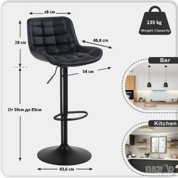 Бар столът може да се регулира плавно на височина от 59 см. до 83 см. чрез повдигане на лоста под седалката с лекота.