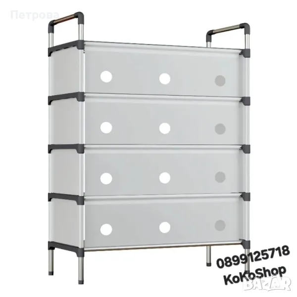 Практичен и функционален шкаф за обувки на четири нива.Шкафът е със стабилна метална основа и пластмасови рафтчета и вратички. Размери:60х28х90 см.Материал:пластмаса и металМаксимално натоварване:30 кг.Цена 29 леваДоставка в рамките на два работни дни, с куриерска фирма Еконт, с опция преглед преди плащане.