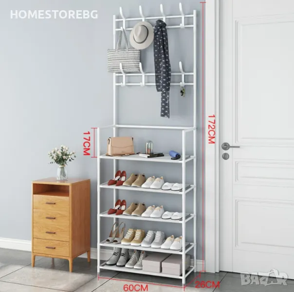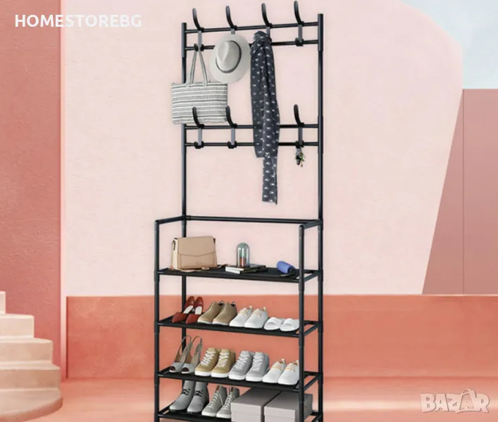 🥿👒🧥 Организирайте и подредете вашите обувки, чанти и връхни дрехи с нашата многофункционална стойка. Компактният и стилен дизайн я прави идеална за всяко помещение.