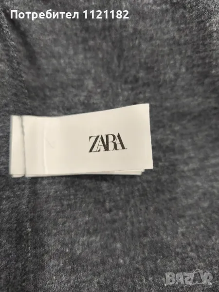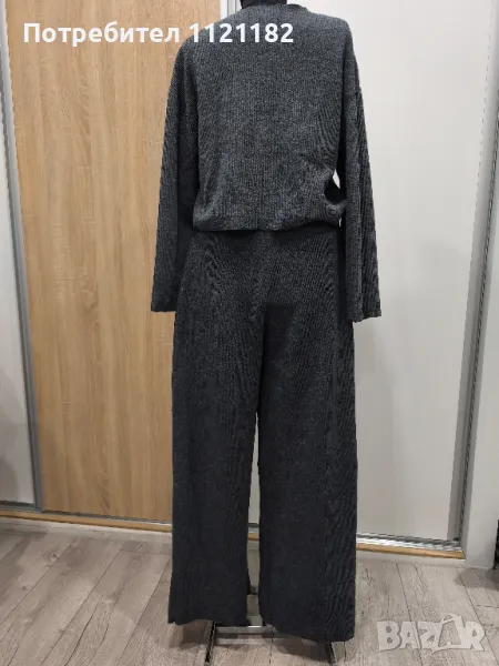 Тъмно сив дамски комплект плетиво. Горната част е жилетка,а долната панталон с широки крачоли без джобове на марката ZARA.Размер L.Обличан два пъти.Няма никакви забележки.
