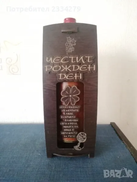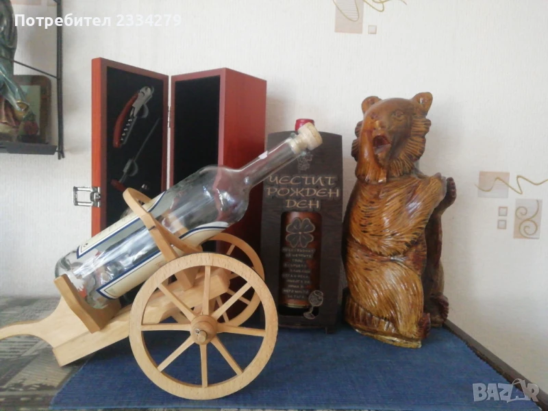 N:1(НЕВАЛИДНА); N:2 луксозна кутия с бутилка изработена от дърво и орнаментирана с пожелания за рожден ден, комплектен подарък, цена 8€.; N:3 стойка поставка за вино и други алкохолни напитки с форма на колисар-количка, изцяло е ръчно изработена от дърво, цена 8€., поставя се бутилка, може да се ползва като подарък за празник.; N:4 (НЕВАЛИДНА) .
