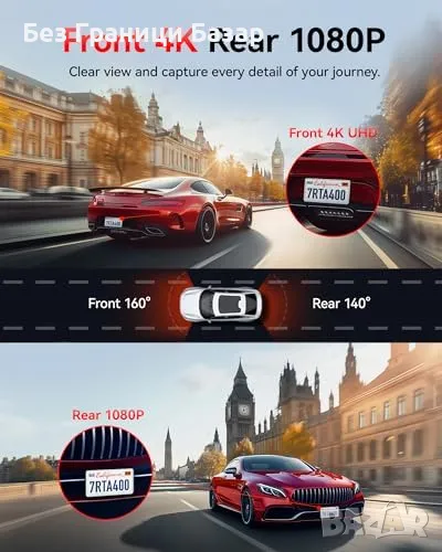 4K+1080P двойна камера – Заснема кристално ясни детайли отпред (4K) и отзад (1080P).
