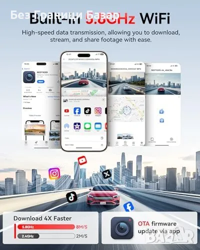 Вградена 5.8GHz Wi-Fi връзка – До 4 пъти по-бърз трансфер на видео чрез приложение.