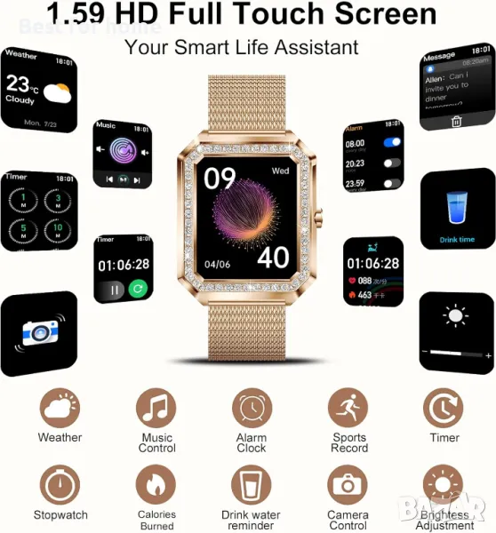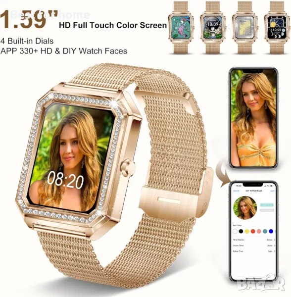 Уникален и елегантен дизайн: смарт часовник за жени, малък, каишката е изработена от висококачествен метал, изискан и красив външен вид, пълен с елегантност. 1.59" Full Touch Screen, 240×288 пиксела цветен екран с висока разделителна способност и голям гладък екран, показва отлично качество на изображението. Дамски смарт часовник с 2 ултра-удобни и ултра-леки сменяеми каишки (силикон + метал). За да отговори на нуждите ви за стил при всеки повод.