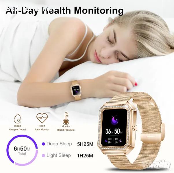 Дамски смарт часовник с Bluetooth повикване/набиране - Винаги в движение, винаги свързан. Бъдещето на здравето: Вашият интелигентен личен асистент измерва нивата на кислород в кръвта ви с революционен сензор и приложение. Контролира сърдечната честота. С други иновации като проследяване на кислорода в кръвта и проследяване на съня, за да сте здрави от главата до петите, той показва повече здравни прозрения. Дамският смарт часовник е съвместим с Android и iOS, също така поддържа интимни функции като прогноза за времето, 67 водоустойчивост, здраве на жените, управление и възпроизвеждане на музика, управление на камерата, таймер, будилник, напомняне за заседнал/пиене на вода и др.