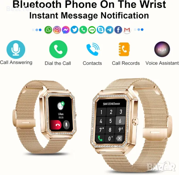 【Интелигентен часовник за повикване и отговаряне с Bluetooth】 Дамски интелигентен часовник с правоъгълен циферблат, стоманена каишка, силиконова каишка. Вграден висококачествен Bluetooth чип, след като смарт часовникът е свързан към APP, е възможно да се провеждат разговори и да се четат съобщения през дамския смарт часовник хронометър. Когато вдигнете китката си, екранът автоматично ще се включи и можете лесно да контролирате WhatsApp, Instagram, Facebook, имейл, текстови съобщения и др. Съобщения