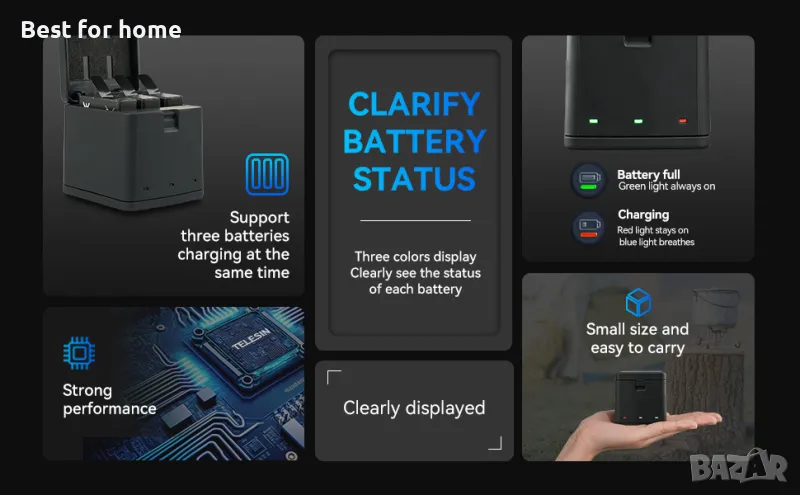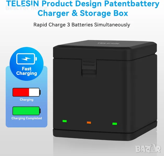 ◀ Кутията за зареждане съдържа 3 отделни батерийни клетки за батерия, позволява едновременно зареждане на 3 батерии Hero 8/7/6/5, може да се използва като зарядно устройство за батерии и заредена кутия за съхранение.