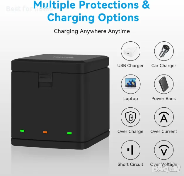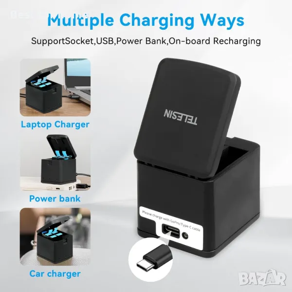 TELESIN 2 батерии за Hero 8/7/6/5 с 3-канално USB устройство за бързо зареждане на батерии с кабел Type-C